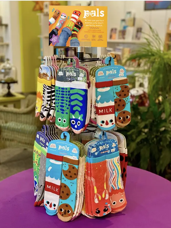 These best selling mismatched socks feature our favorite sugary sprinkled foods - Donuts and Ice Cream! They are a super fun kids clothing gift and the perfect addition to any Easter Basket. This pair is from the Pals Taste Buds Collection designed by artist Michelle Romo (aka Crowded Teeth). Their friendship is so sweet, they will never DESSERT each other. Let's be Pals! We don't have to match to be besties. DETAILS • Crew-length tube socks for toddlers and kids • Non-Slip Grips for safety • Unisex fit for boys and girls • Designs are woven in (never printed on) • Image quality stays great when these fun socks are worn and stretched! • Super stretchy, comfy socks everyone loves. • A perfect birthday present! • Medium-weight, quality thickness • Combed Cotton 76% Polyester 13% Nylon 9% Spandex 2% • Display Pals hanging up, and they will be the best selling gift in your store!