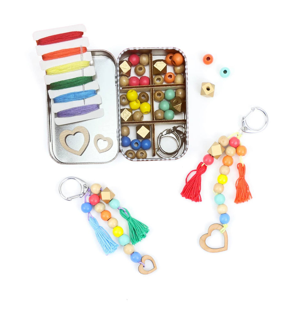 • Recommended for ages 5+ • Plastic free • Promotes fine motor skills • Perfect for till point add-ons • All materials provided • Ideal for party favours & stocking fillers • UKCA/UKNI/CE tested & FSC certified Ideal for children wishing to gift their special friend with something heartfelt and personal, our You & Me Keyring is the perfect token of love. Our kit comes with all the necessary components to make two unique keyrings & is guaranteed to provide a fun-filled craft activity. Includes a simple keyring mechanism, a range of different coloured threads, multi-coloured spherical beads & geometric beads, matching ‘big’ and ‘little’ heart charms and a tassel-making guide. In a bid to banish plastic from our homes, Cotton Twist products are lovingly assembled by hand, & all components are as good as we can possibly make them. MATERIALS: wooden spherical beads, cherry wood heart cut outs, 6 colour thread cotton winder, keyring fobs, needle Dimensions - gift tin 96 X 59 X 21mm