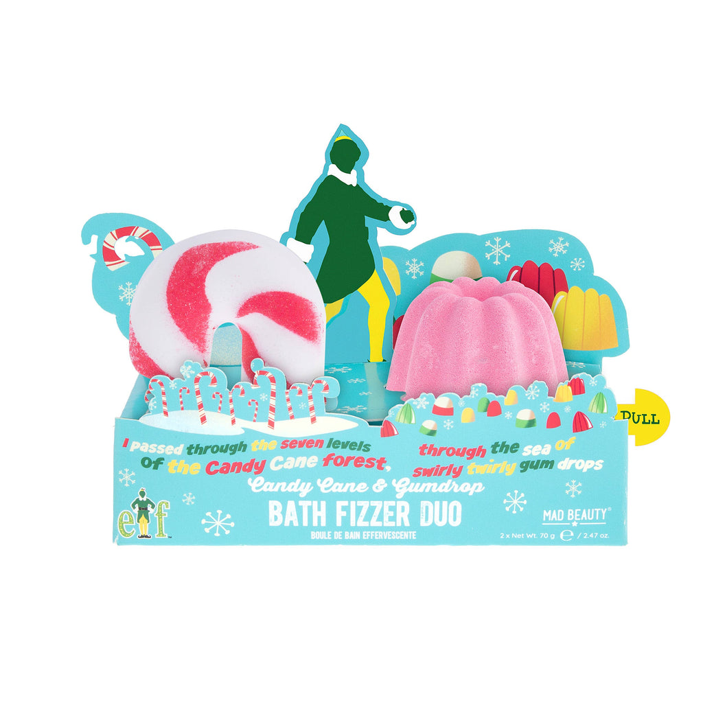 Pull the lever on this 3D pop up giftbox to watch Buddy walk through the seven levels of the candy cane forest and the sea of twirly swirly gumdrops! This super giftable duo features two full size candy cane and gumdrop shaped fizzers fragranced with swirly gum drops. Pop one in the tub to release its festive aroma and relax and unwind.
