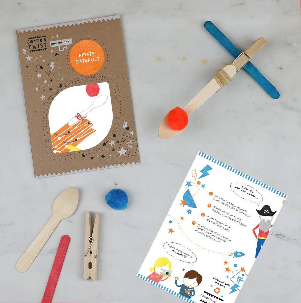 • Recommended for ages 3+ • Sustainable eco-friendly materials • Promotes fine motor skills • Perfect for till point add-ons • All materials provided • Ideal for party favours & stocking fillers • UKCA/UKNI/CE tested & FSC certified Children can construct a catapult using the pegs, lolly sticks, spoon, elastics & glue dots. Add a pom pom to the spoon & see how far it can fly in the air. Practice makes perfect on the pirate aim. In a bid to banish plastic from our homes, Cotton Twist products are lovingly assembled by hand, & all components are as good as we can possibly make them. MATERIAL - 2 wooden pegs, wooden spoon, lollipop stick, elastic band, glue dots, pom pom DIMENSIONS - a recyclable kraft envelope measuring 16.5cm by 11.5cm together with an A6 printed instruction card