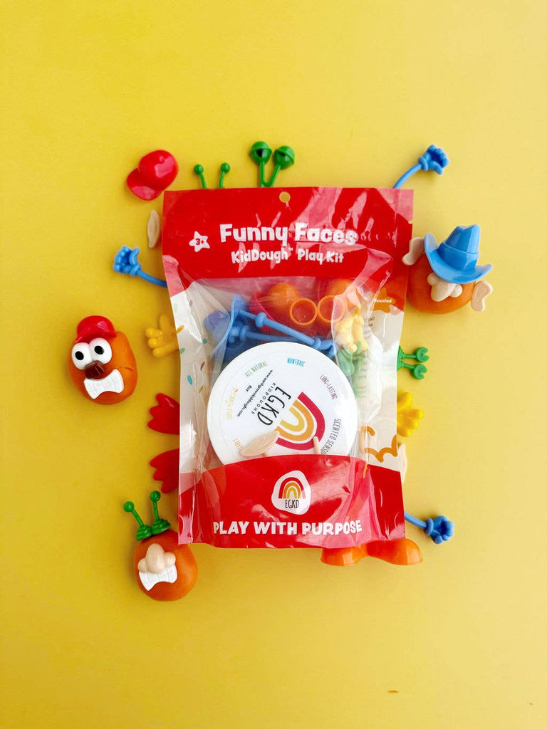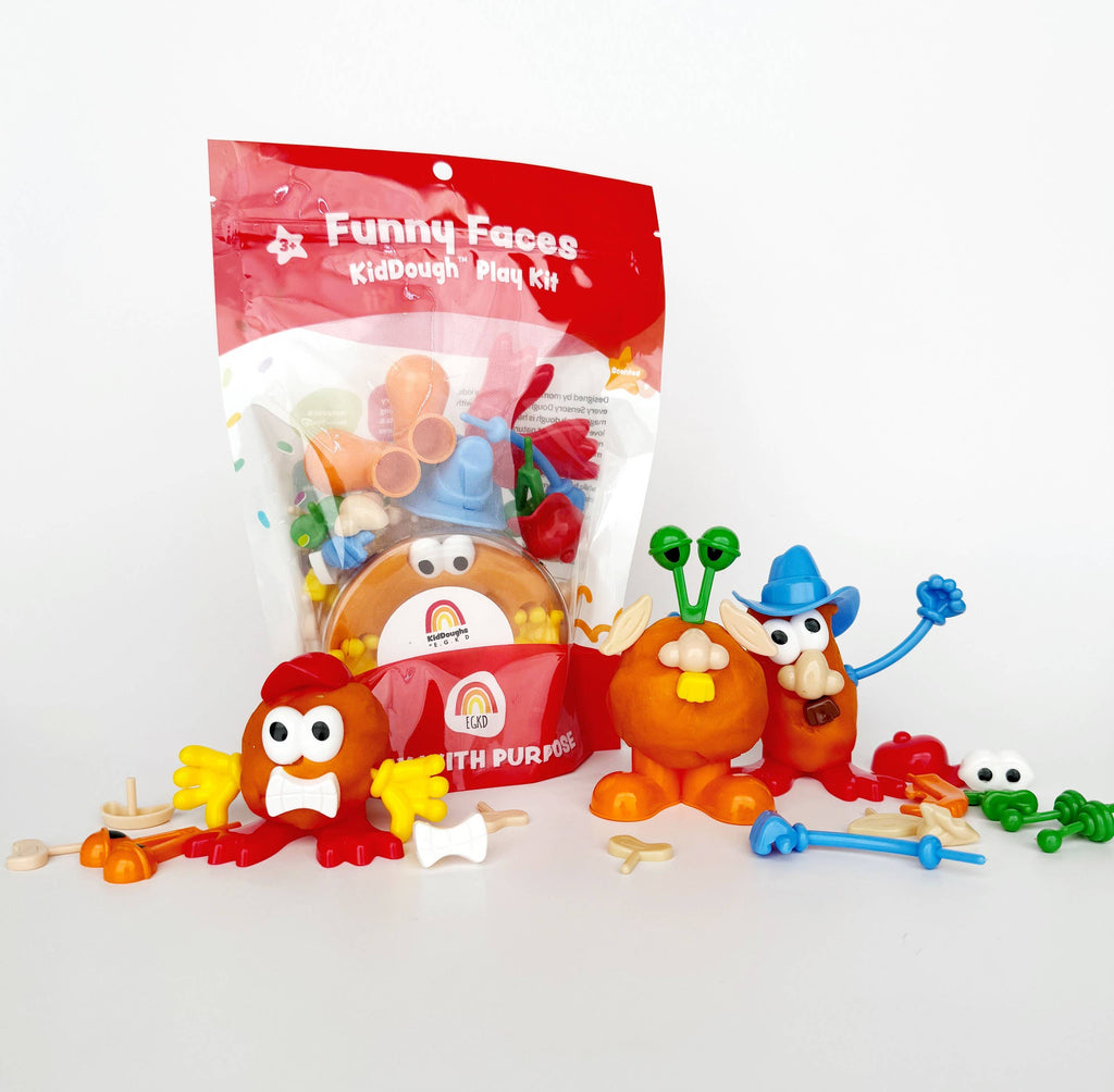 Make funny faces with our award-winning KidDough and fun accessories! Includes: 8 oz Orange (Mango Tango) KidDough and 21 Funny Face Making Pieces Our super silky sensory doughs are buildable like a modeling compound however they are softer, more pliable, and far longer lasting than any you have tried before! Every all-natural KidDough is made with non-toxic food grade ingredients and is totally taste safe. These super durable doughs last for at least 120 hours of active air time and easily wash out of carpets and fabric with just warm water. If ever you experience drying, just knead to rehydrate. KidDough is the best way to play dough!